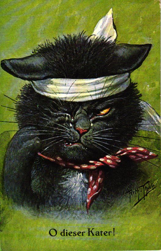 Katze mit Kopfverband, „O dieser Kater“, sign. Arthur Thiele, rückseitig beschriftet, nicht postalisch gelaufen, nur sehr kleine Altersspuren.