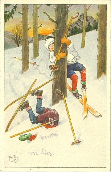 Ski, Skifahrer, sign. Arthur Thiele, nicht sehr häufige Karte aus der Verlag A. Ruegg Zürich, postalisch gelaufen, Briefmarke entfernt, sonst nur geringe Altersspuren.