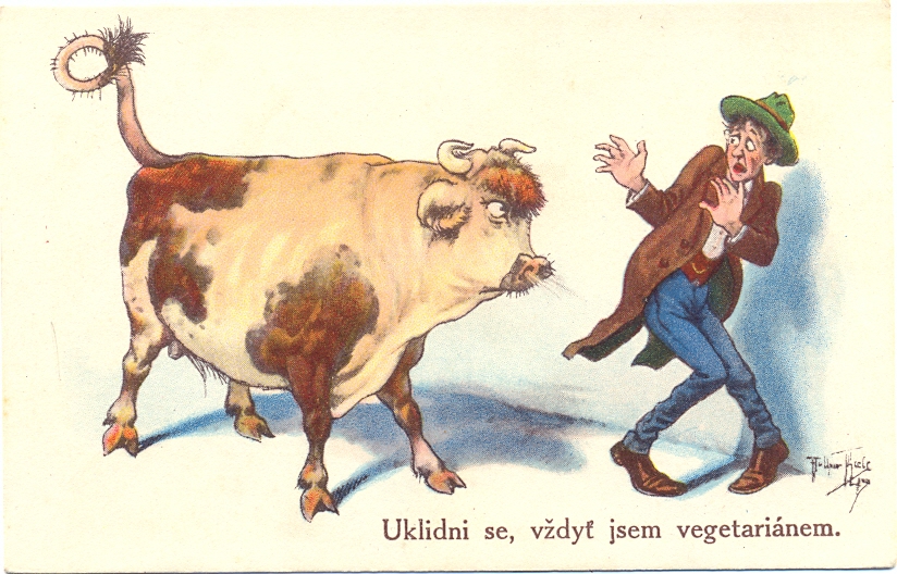 Stier mit ängstlichem Mann, sign. Arthur Thiele, mit tschechischer Inschrift, in Deutsch: beruhige dich, siehst du nicht das ich Vegetarier bin, Verlag Lederer & Popper Nr. 3018, nicht beschriftet, nicht gelaufen, einwandfreie Erhaltung.