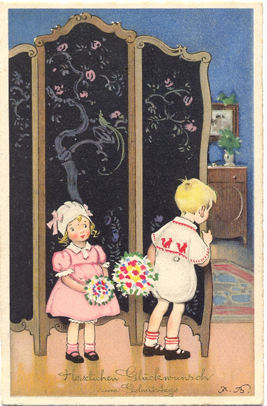 Geburtstag, Kinder mit Blumen, sign. Baumgarten, um 1920/30, rückseitig beschriftet, nicht postalisch gelaufen, einwandfreie Erhaltung.