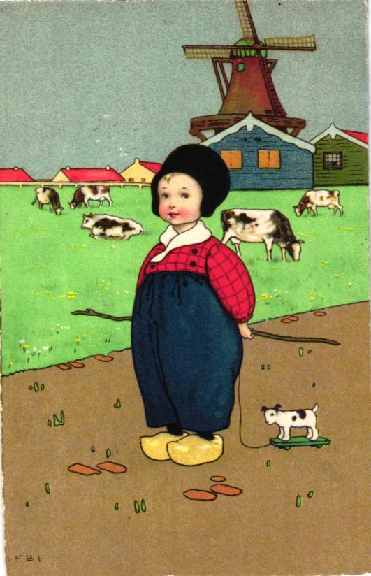 Kind mit Holzschuhen, Windmühle, sign. Fritz Baumgarten, nicht beschriftet, nicht gelaufen, rückseitig gering verschmutzt, sonst ordentliche Erhaltung.