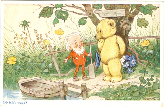Zwerg mit Teddy, sign. Baumgarten, rückseitig beschriftet, nicht postalisch gelaufen, gering eckbestossen, sonst einwandfreie Erhaltung.