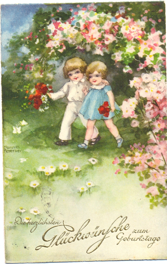 Geburtstag, Kinder mit Blumen, sign. Hannes Petersen, 1933 postalisch gelaufen, winzig fleckig im Unterrand (an der selben Stelle auch rückseitig), insgesamt aber noch gute Erhaltung.