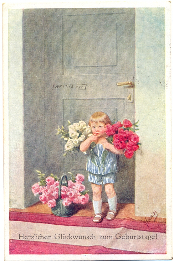 Geburtstag, Kind mit Blumen, sign. Feiertag, 1922 postalisch gelaufen, nur sehr kleine Altersspuren.
