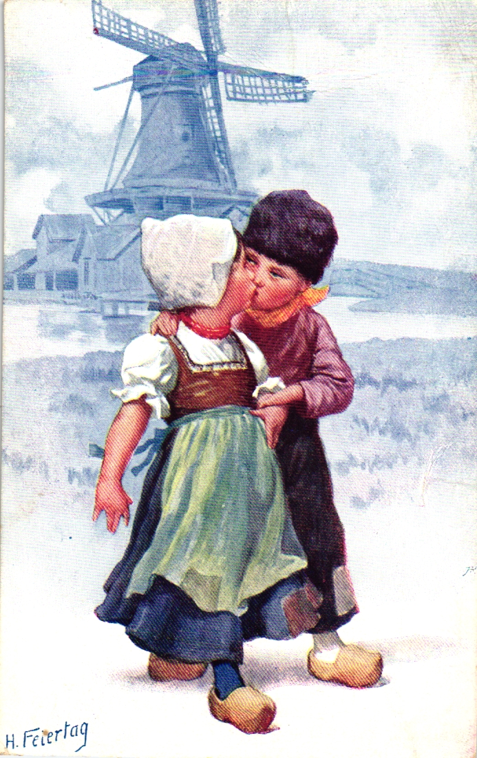 Kinder, Junge küsst Mädchen, Holzschuhe, Windmühle, sign. Feiertag, um 1910/20, rückseitig beschriftet, nicht postalisch gelaufen, winzig eck- bzw. randbestossen, sonst ordentliche Erhaltung.