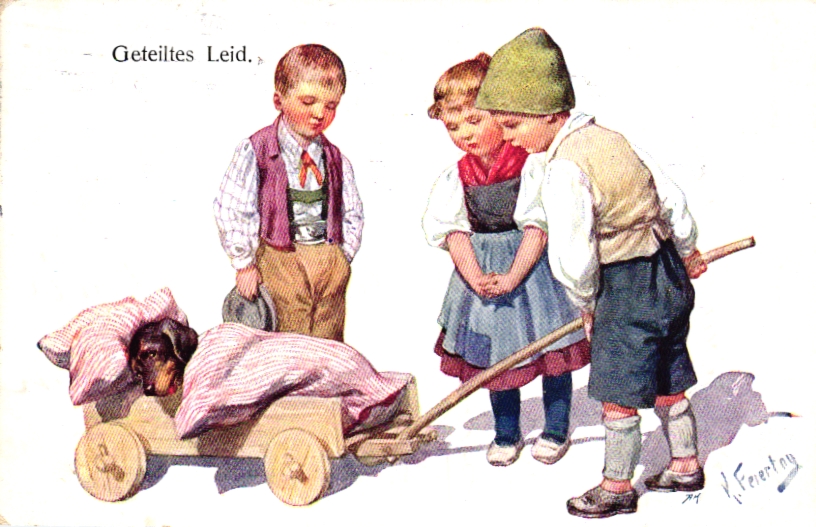 Kinder mit Dackel, sign. Karl Feiertag, 1912 postalisch gelaufen, gering eckbestossen, sonst ordentliche Erhaltung.