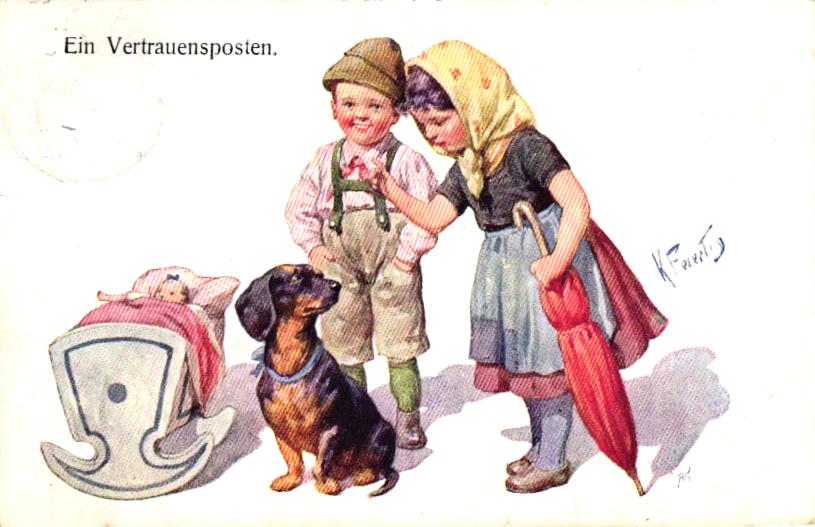 Kinder, Wiege, Dackel, sign. Feiertag, 1912 postalisch gelaufen, leichter Bug unten rechts, sonst nur kleinere Altersspuren.