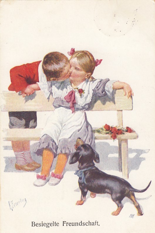 Küssende Kinder mit Dackel, sign. Feiertag, 1913 postalisch gelaufen, nur kleinere Altersspuren.