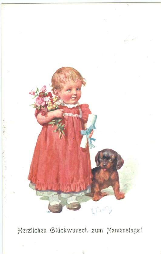Mädchen mit Dackel, sign. Feiertag, nicht beschriftet, nicht gelaufen, nur geringe Altersspuren.