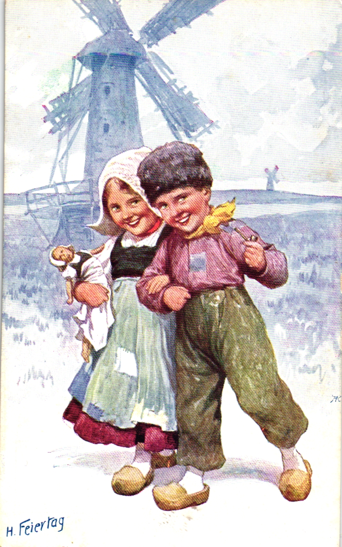 Mädchen mit Puppe, Junge, Windmühle, sign. Feiertag, um 1910/20, nicht beschriftet, nicht gelaufen, vorderseitige gute Erhaltung, rückseitig etwas verschmutzt bzw. fleckig.