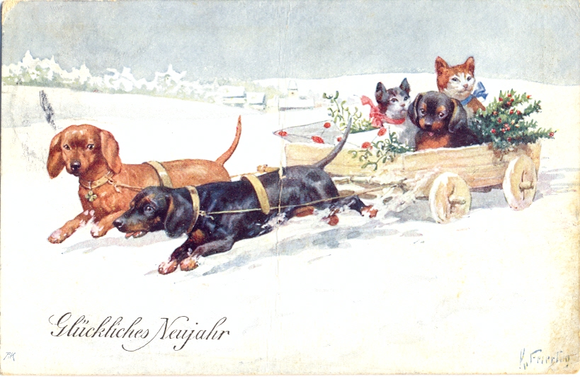 Neujahr, Dackel, Kutsche, sign. Feiertag, 1909