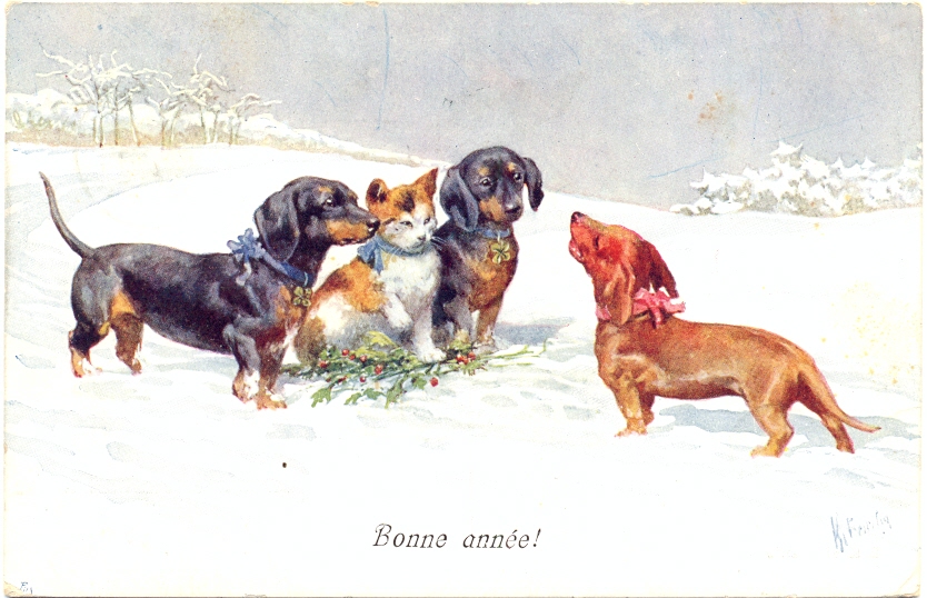 Neujahr, Dackel mit Katze, sign. Feiertag, 1910 postalisch gelaufen, gering eckbestossen, vorder- u. rückseitig etwas fleckig.