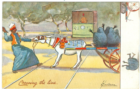 Esel überquert Strassenbahnschienen, sign. Lance Thackeray, 1930, rückseitig beschriftet, nicht postalisch gelaufen, gesuchte Karte mit nur geringen Altersspuren.