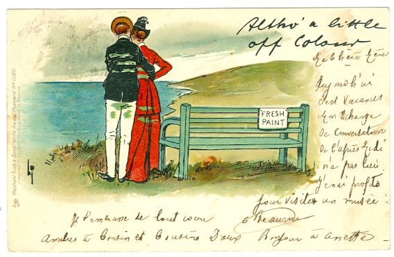 Liebespaar, frisch gestrichene Bank, sign. Lance Thackeray, 1902 postalisch gelaufen, gering eckbestossen, leichte Eckknitterung, schöne Karte mit nur kleineren Altersspuren.
