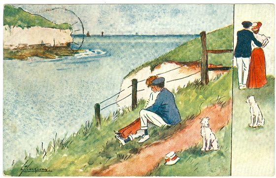 Liebespaar mit Hund, sign. Lance Thackeray, um 1920 postalisch gelaufen, Briefmarke vermutlich vorderseitig angebracht und entfernt, leicht eckbestossen, kleine Altersspuren.