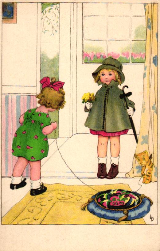 Kinder, Besuch, Raubkatze als Spielzeug, sign. Lia Döring, Verlag Meissner & Buch Leipzig, um 1910/20, nur sehr kleine Altersspuren.