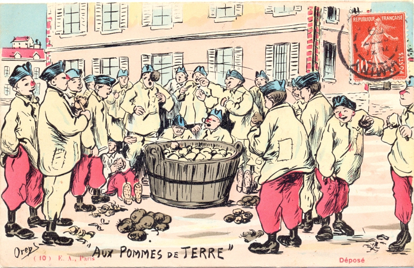 Militär, Soldaten schälen Kartoffeln, sign. Orens, 1909 postalisch gelaufen, einwandfreie Erhaltung.