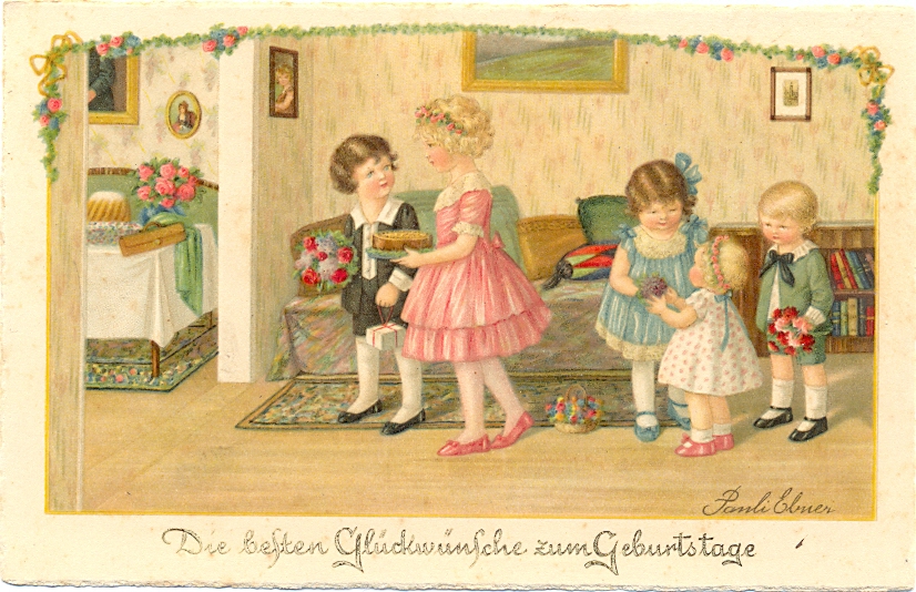 Geburtstag, Kinder, sign. Pauli Ebner, um 1930, rückseitig beschriftet, nicht postalisch gelaufen, sehr kleiner Randbug unten links, sonst nur geringe Altersspuren.