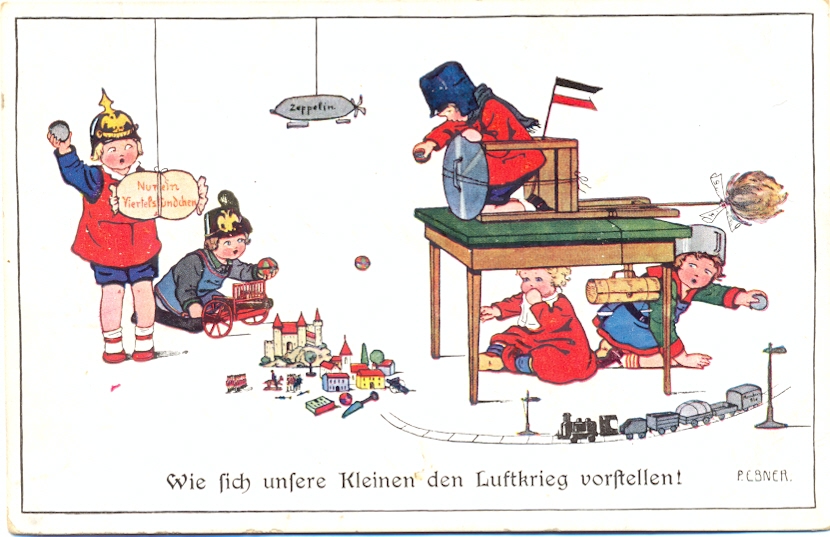 Kinder, Eisenbahn, Zeppelin, Eisenbahn, 1.WK, sign. Pauli Ebner, um 1915 als Feldpostkarte gelaufen, beliebte Karte mit nur kleineren Altersspuren.