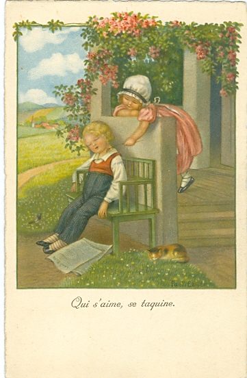 Kinder, schlafendes Kind, Zeitung, Katze, sign. Pauli Ebner, Verlag AGB Nr. 1034, 1931 postalisch gelaufen, nur kleinere Altersspuren.