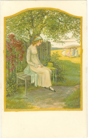 Mädchen, Parkbank, Kinder spielen blinde Kuh, sign. Pauli Ebner, Verlag AR Nr. 1406, nicht beschriftet, nicht gelaufen, nur sehr geringe Altersspuren.