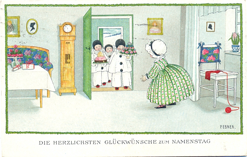 Namenstag, Kinder, sign. Pauli Ebner, Verlag Munk, 20er Jahre, postalisch gelaufen, links oben leichter Randabdruck des rückseitigen Wellenstempels, sonst nur geringe Altersspuren.