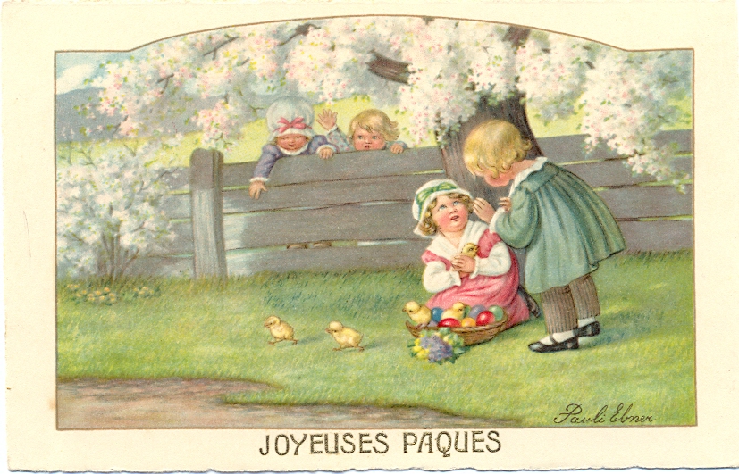Ostern, Kinder, Eier, Küken, sign. Pauli Ebner, nicht beschriftet, nicht gelaufen, winziger Fleck links unten, sonst einwandfreie Erhaltung.