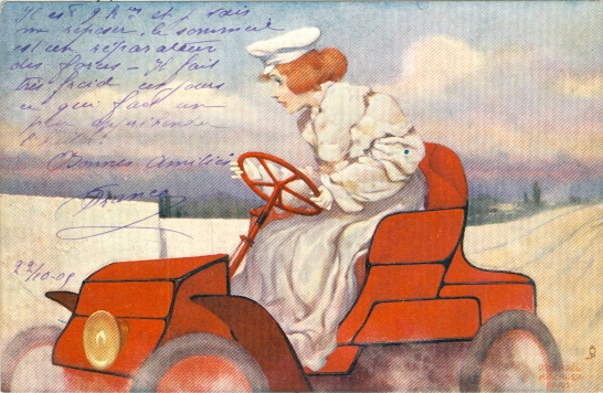 Dame im Auto, sign. Raphael Kirchner, beschriftet und mit Briefmarke versehen, Briefmarke mit Federzug entwertet, besonders schöne Raphael Kirchner Ansichtskarte, nur sehr geringe Altersspuren.