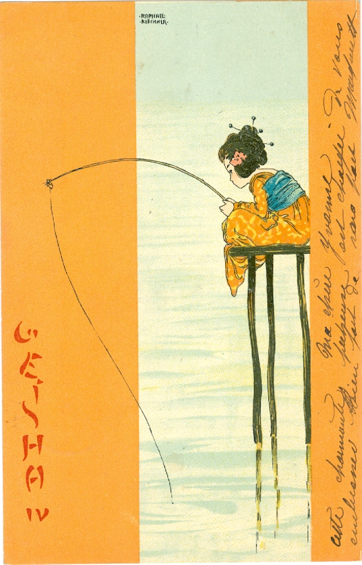 Raphael Kirchner, „Geisha“, Dell`Aquila D.8/1-4, postalisch gelaufen, oben links sehr kleiner und nur leichter Eckbug, nur kleine Altersspuren.