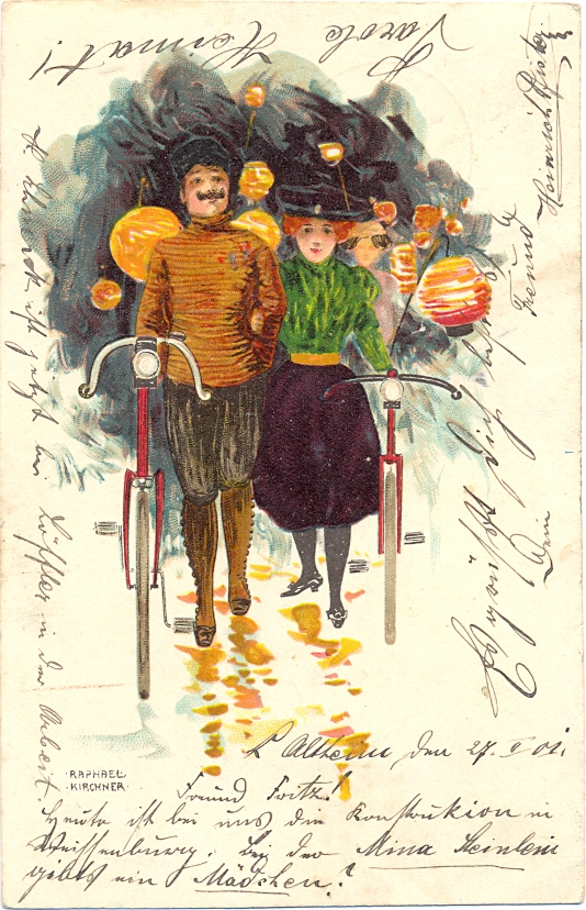 Raphael Kirchner, Paar mit Fahrrad, Dell Aquila D1-6, 1901 postalisch gelaufen, die bliebe Karte aus der Radfahrer Serie, nur sehr kleine Altersspuren.