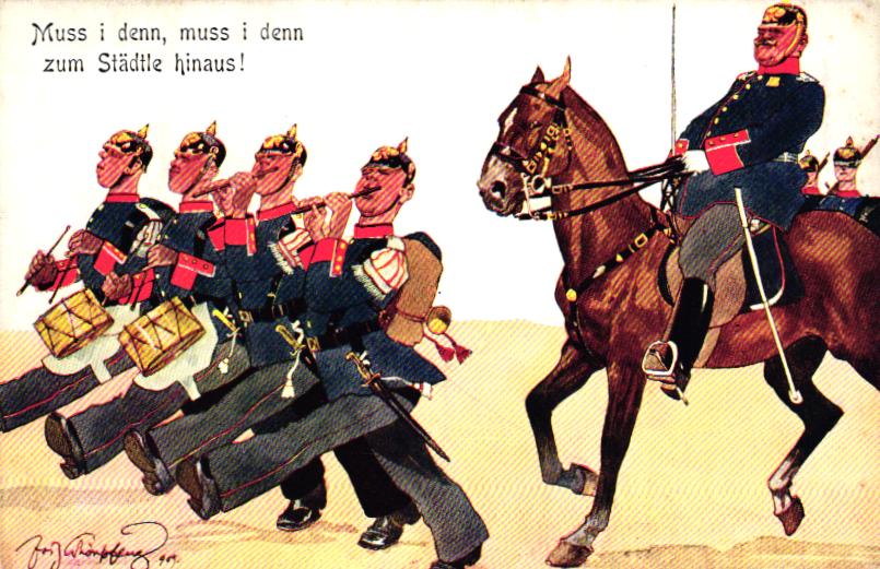 Militär, Soldaten, „Muss i denn zum Städtle hinaus“, sign. Schönpflug, nicht beschriftet, nicht gelaufen, minimal fleckig, rückseitig leicht unsauber, insgesamt aber noch gute Erhaltung.