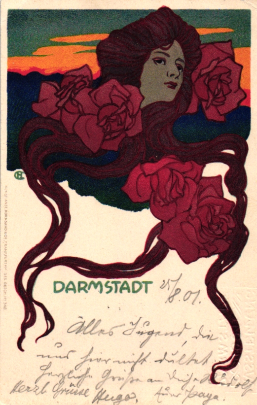 Dame mit Rosen, Darmstadt, Jugendstil, Christiansen, 1901 von Darmstadt nach Neustadt a. H. versandt, oben rechts und links leichter Eckbug, schöne und gesuchte Karte in sonst ordentlicher Erhaltung.