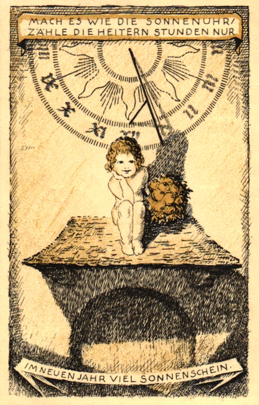 Neujahr, Sonnenuhr, Künstlerkarte, 1922 in der Schweiz postalisch gelaufen, schöne Karte, nicht sehr häufiges Motiv, einwandfreie Erhaltung.