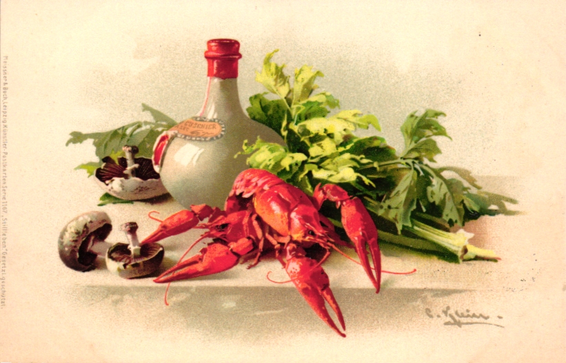 Stilleben, Pilze, Meeresfrüchte, sign. C. Klein, um 1900/05, nicht beschriftet, nicht gelaufen, vorderseitig schwache Spuren an den Ecken (ehemalige Albumbefestigung), rückseitig etwas deutlicher, insgesamt aber ordentliche Erhaltung.
