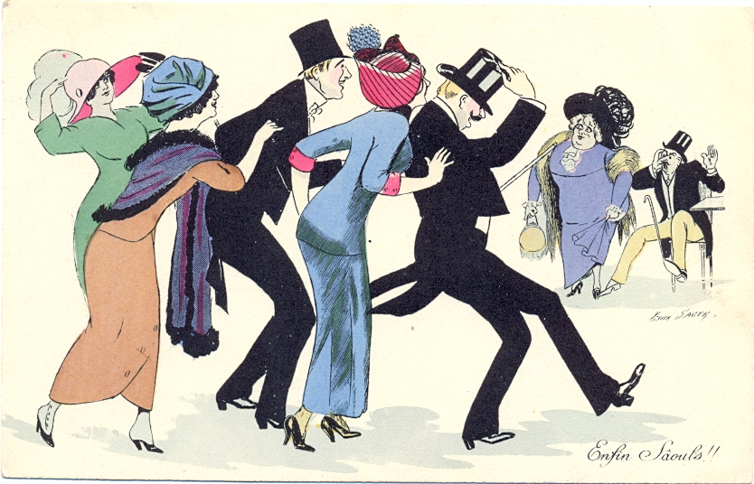 Lustige Gesellschaft, sign. Xavier Sager, 1916, rückseitig beschriftet, nicht postalisch gelaufen, nur sehr kleine Altersspuren.