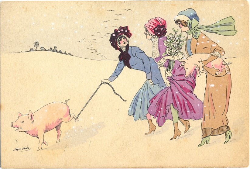 Neujahr, Damen mit Schwein, sign. Xavier Sager, um 1905/10, nicht beschriftet, nicht gelaufen, gering unsauber, leicht fleckig, jedoch eine der besonders schönen Sager Karten !