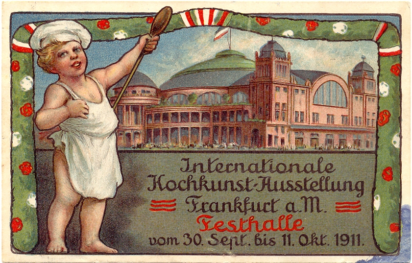 Kochen, Kochkunst-Ausstellung, Frankfurt a.M., 1911 in Frankfurt nach Oberstaufen im Allgäu versandt, unten rechts Eckbug und Tintenfleck, sonst ordentliche Erhaltung.