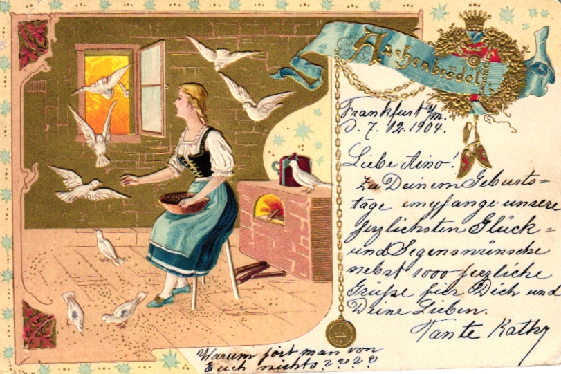 Märchen, Aschenbrödel, Prägekarte, 1904 von Frankfurt / Main nach Finnland versandt, sehr schöne und in dieser Form nicht häufige Karte, Eckbug oben links, kleiner Eckbug unten rechts, insgesamt aber ordentliche Erhaltung.