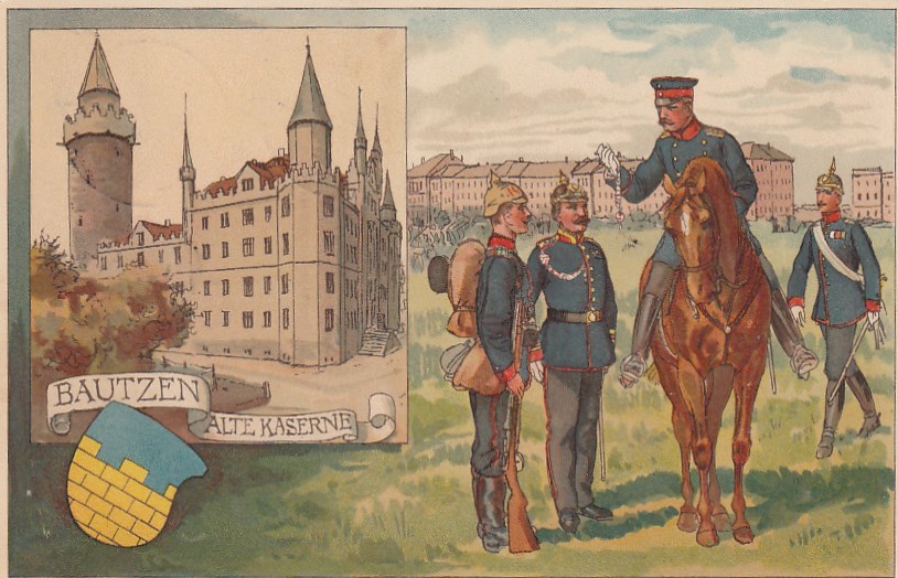 Bautzen in der Lausitz, Alte Kaserne, 4 Inf Regt 103, 1909 in Sintwitz versandt, interessante Übersee-Destination, versandt nach Bradburg / USA, für eine Überseekarte in sehr guter Erhaltung, lediglich unten links (neben dem Wappen) winzigste kleine Kratzspur.