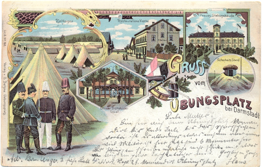 Darmstadt, Übungsplatz, Farb-Litho, 1900 postalisch gelaufen, unten rechts kleiner Eckbug, sonst nur sehr geringe Altersspuren.