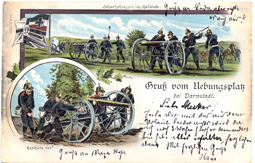 Darmstadt, Übungsplatz, Farb-Litho, 1900 postalisch gelaufen, gering eckbestossen, Eckbug und etwas randoxidiert, jedoch sammelwürdige Erhaltung.