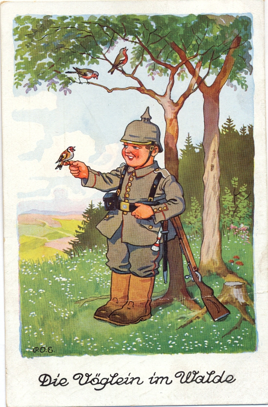Junge als Soldat, Vögel, 1916 postalisch gelaufen, unten größerer Bug, insgesamt aber sammelwürdige Erhaltung.
