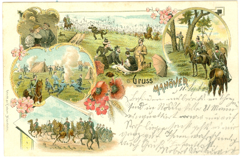 Manöver, Farb-Litho, 1903 von Schongau nach Nesselwang versandt, nur sehr geringe Altersspuren.