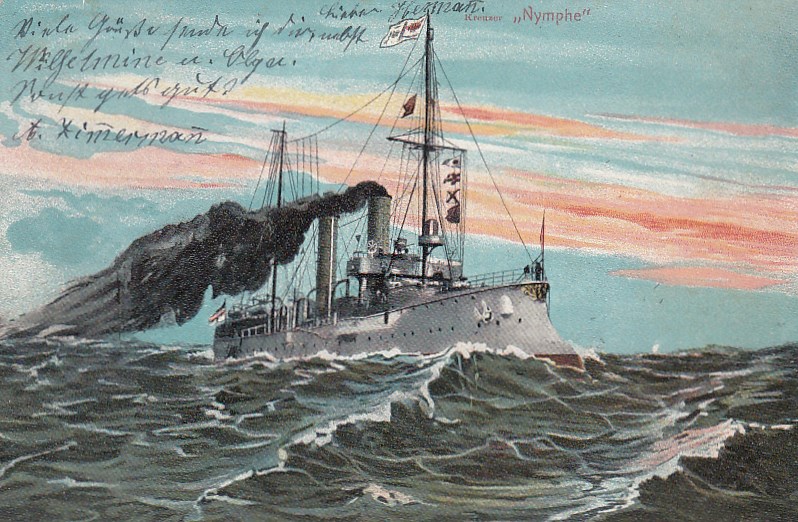 Marine Kreuzer „Nymphe“, 1905 von und nach Kiel versandt, gering eck- bzw. randbestossen, insgesamt nur kleine Altersspuren.