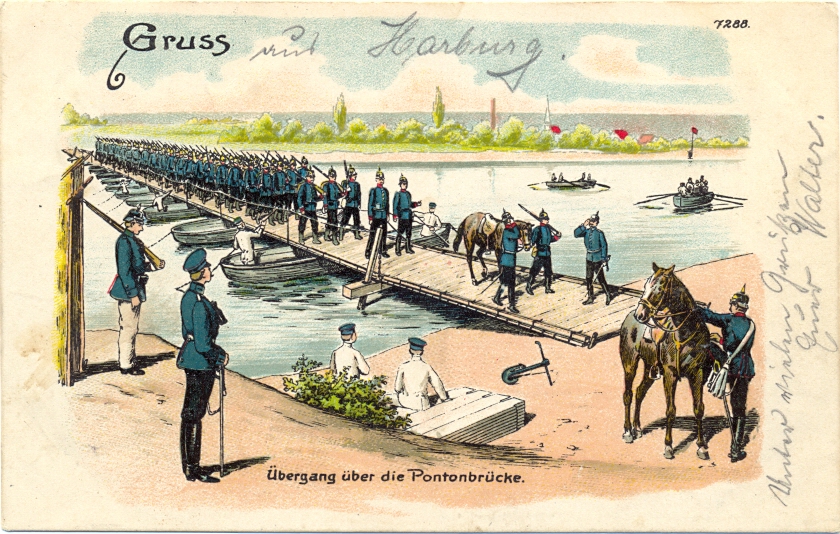Militär, Soldaten, „Übergang über die Pontonbrücke“, 1909 postalisch gelaufen, nur sehr kleine Altersspuren.