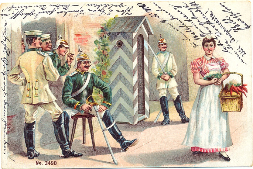 Militär, Wachhäuschen, Frau mit Lebensmitteln, Farb-Litho, 1901