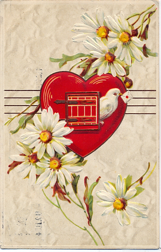 Blumen, Herz, Taube, Prägekarte, 1911 postalisch gelaufen, etwas eckbestossen, kleiner Eckbug, etwas Stempelspuren vorderseitig.