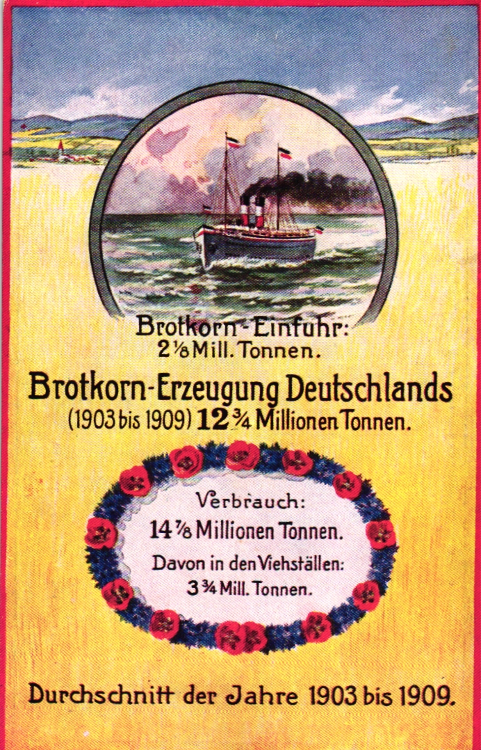 Brotkorn Erzeugung in Deutschland, 1909, Informationskarte zum Verbrauch, Karte aus der Serie „Volkswirtschaftliche Wahrheiten, Karte Nr. 10“, nicht beschriftet, nicht gelaufen, gering eck- bzw. randbestossen, sonst ordentliche Erhaltung.