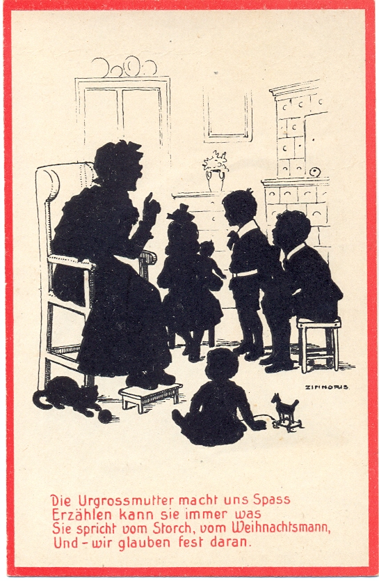 Grossmutter erzählt, Kinder, Katze, Scherenschnitt AK, sign. Zinnoris, um 1920/30, schöne Scherenschnitt Ak mit nur sehr geringen Altersspuren.