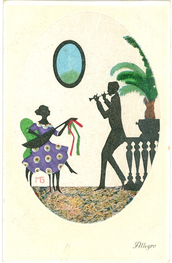 Mann, Frau, Musik, „Allegro“, Marte Graf, um 1920, rückseitig gering beschriftet, nicht postalisch gelaufen, vorderseitig unten kleine Stiftspur, sonst nur geringe Altersspuren.